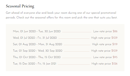 Display time frames and prices for your special seasonal room offers during various promotional periods.